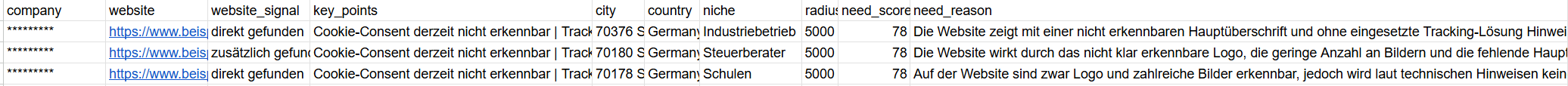 - Output nutzbar: Priorisierte Bedarfsanalyse Shortlist mit Gesprächsanlass je Kontakt.