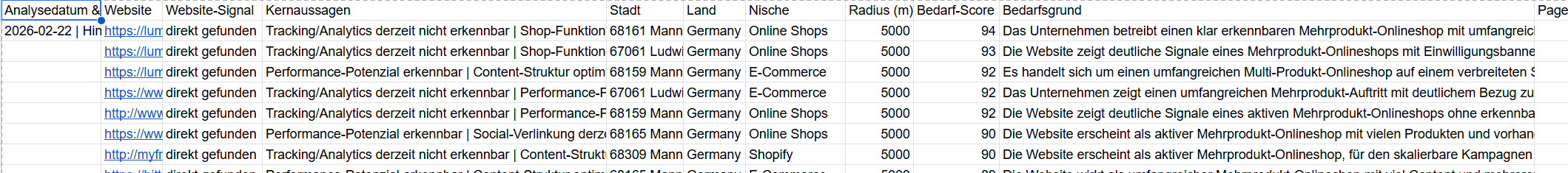 Oben sehen Sie die Unternehmen mit dem klarsten Gesprächsanlass, inklusive Begründung, warum genau jetzt ein Kontakt sinnvoll ist.